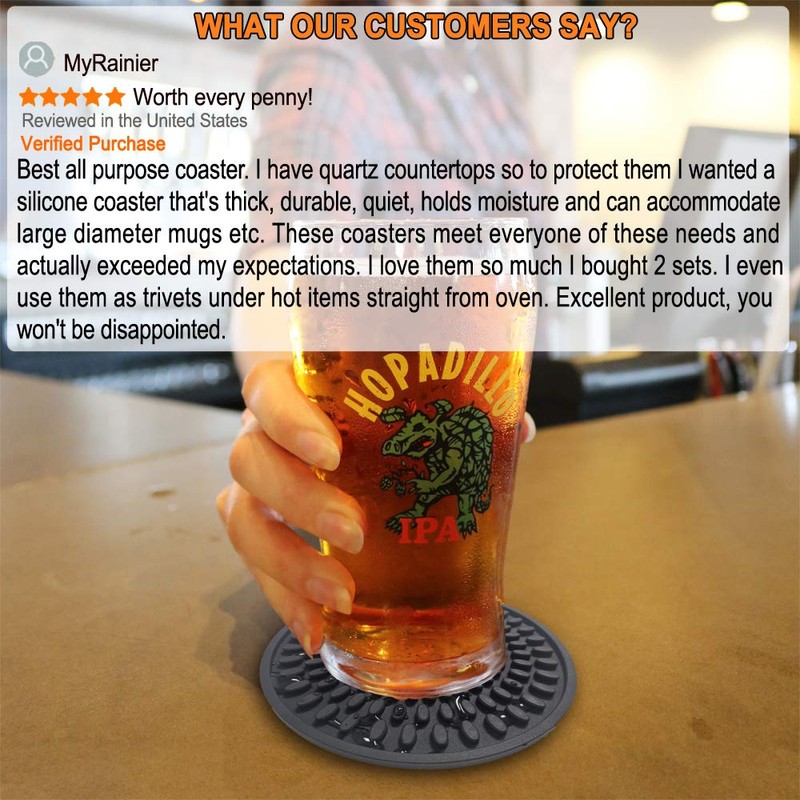 - WARRANTY: Our reusable rubber drink coaster comes with 60 days Money Back Guarantee and Lifetime Warranty. Buy today RISK-FREE. Any problems with our beverage silicone drink coasters please feel free to contact us.
