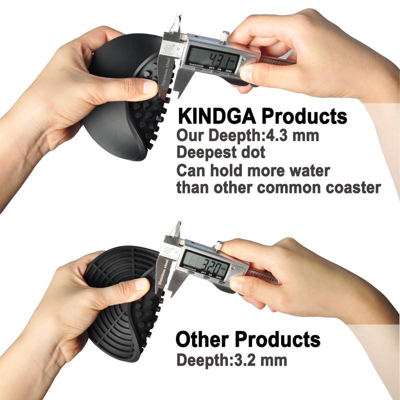 - PERFECT SIZE & DEEP TRAY: Kindga large drink coasters diameter 4.3 inches coasters can fit any large & small mug, cup or bottle. And the deep groove of 4.3 mm, an upgraded version compared to the common version on the market. The upgrade version flat cool rubber coasters for drinks can protect your desk well.