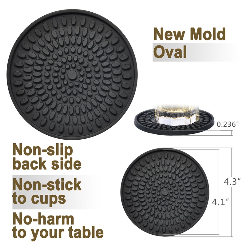 - NON SLIP & EASY TO CLEAN: Kindga black rubber coasters are made from high quality premium food-grade silicone, BPA free and eco-friendly. The backside provides a good firm grip, so your drinking glass will never slide. Designed with many non-sticky "buds" on the top to prevent your glass from sticking to the coaster. The premium unbreakable silicone material makes it easy to clean, you can clean it under the running water or just put it in your dishwasher.