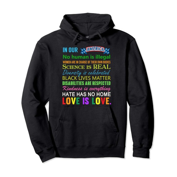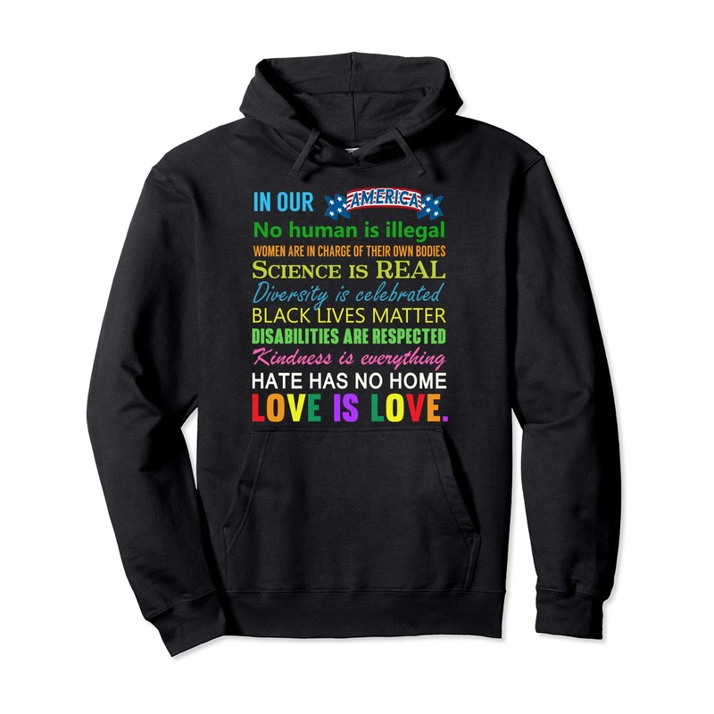 - In OUR America No Human Is Illegal, Women Are In Charge of Their Bodies, Science Is Real, Black Lives Matter, Diversity Is Celebrated, Kindness Is Everything, Hate Has No Home & Love Is Love Inspirational Quote Hoodie