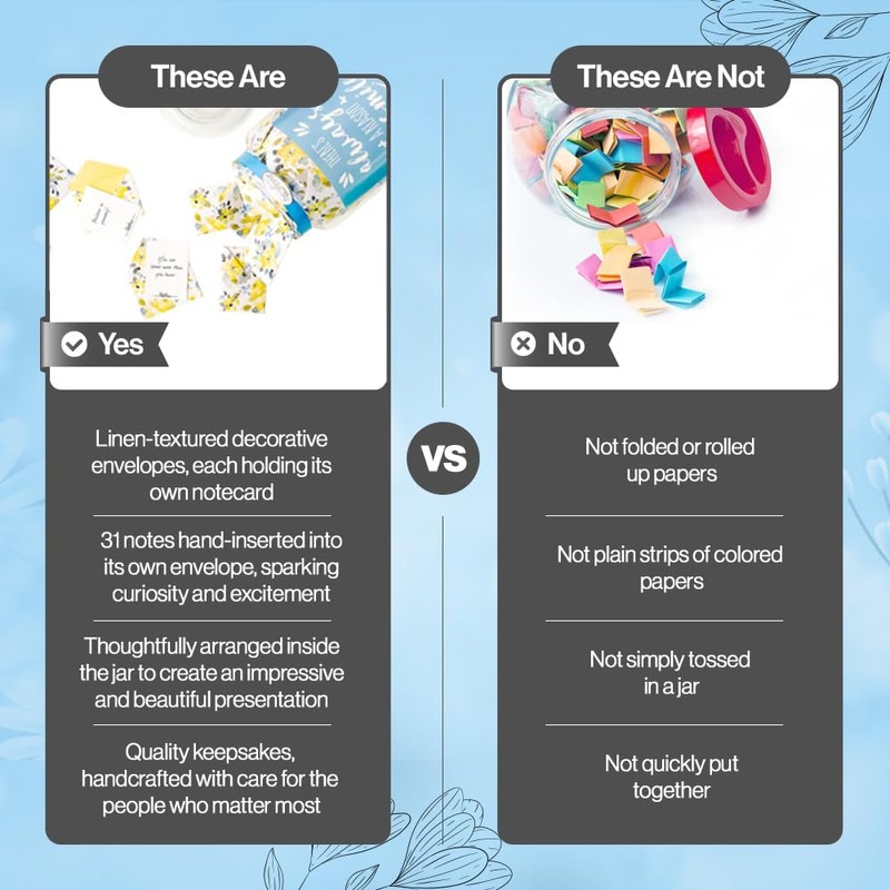 - KEEPSAKE QUALITY: Each note will be tucked into a linen decorative envelope and artfully arranged in a keepsake glass jar embellished with a satin ribbon and charm. Includes a beautiful die-cut window gift box accented with silver foil.