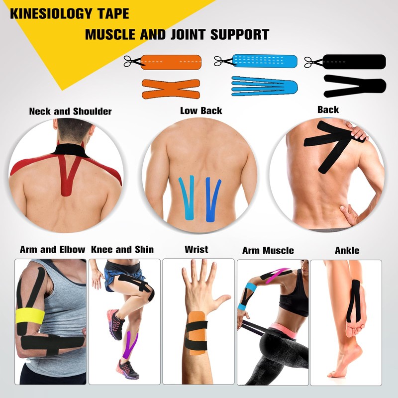 - Kinesiology Tape Support : Our kinesiology tape offers therapeutic support to muscle, joints, and soft tissue areas. Support muscles and joints, shin splint, elbow, wrist, ankle, and shoulder. This tape can improve blood circulation and help injury areas to recovery