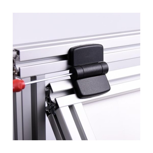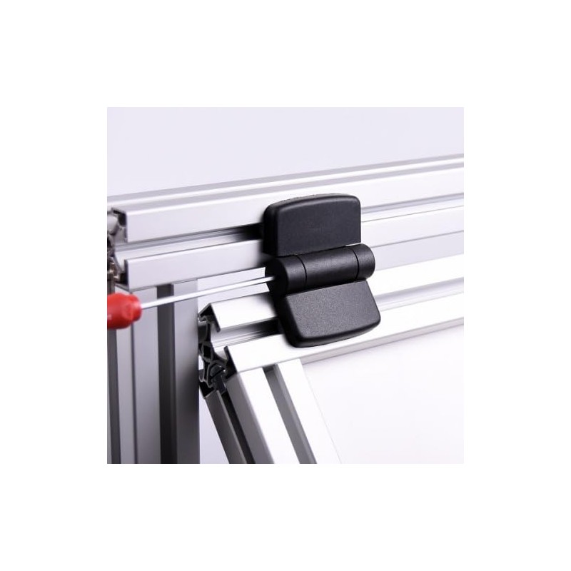 For surface elements and aluminium profiles. The torque (friction) is adjusted with an Allen key on the axle. The friction hinge keeps doors and flaps open or closed at any angle.