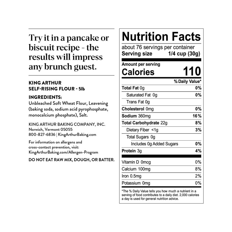 Take your baking to new heights. We didn't invent it, but we perfected it. Praised for its creamy taste and lighter-than-air texture, this unbleached blend of soft wheat flour and non-aluminum baking powder, with a touch of salt, yields ethereally light and tender baked goods, and saves you time in the kitchen, too (two fewer ingredients to mix in!). Try it in a pancake or biscuit recipe - the lofty, fluffy result will impress any brunch guest. 8.5% protein content. Certified kosher. Use self-rising flour in any recipe calling for it. You can also substitute it for all-purpose flour in any recipe that also calls for baking powder - just omit the baking powder and salt, and add an extra tablespoon of self-rising flour. If the recipe calls for baking soda, leave that in - you'll need it to enhance rising and browning. Flour this good doesn't happen by accident. It's the result of attention to detail, consistency in milling, and our desire to ensure that each and every person has the very best baking experience possible. Founded in 1790, King Arthur is a 100% Employee-Owned Company and the nation's premier baking resource, offering everything from top-quality baking products to inspiring recipes.
