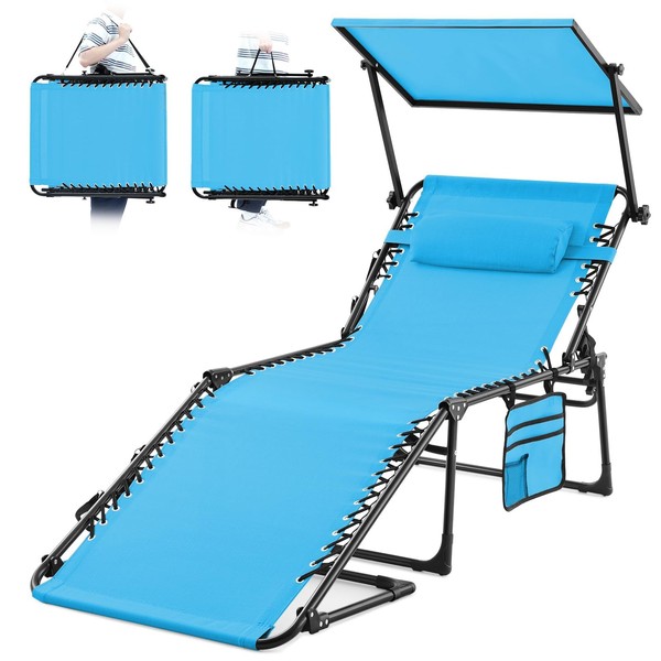 KING BIRD Chaise Lounge Beach Outdoor Chair with Facial Sun Shade, Upgraded Portable Easy2Carry 5-Position Folding Tanning Recliner for Outside Seaside Patio Lawn, Support 350lbs, Size XL-Blue