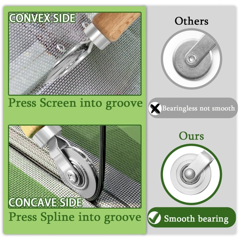 【BEARING ROLLER 】 Most of the screen rollers on the market are simple, but ours are made of a bearing structure, which is stronger, smoother, and has a longer service life.Steel roller has a double side, convex wheel, and concave wheel. CONVEX WHEEL - Press Screen into groove. CONCAVE WHEEL-Press Spline into groove. ERGONOMIC Solid Wood Handle it's easy to hold.
