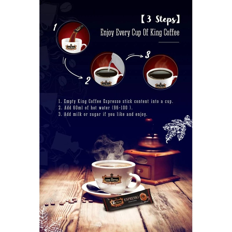 - KING COFFEE INSTANT AMERICANO PREMIUM: Each stick (1g) was enhanced with finely-ground roasted coffee to give the feeling like enjoying an Americano fresh-brew shot from the brewer with typical freshness and aroma of ground coffee, bring to you the entertaining moment and recharge your power for a long day working.