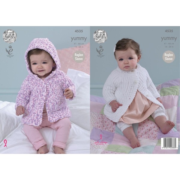 - This Yummy knitting pattern leaflet 4535 by King Cole will instruct you on how to create babies raglan sleeved jackets with either a hood or a round neck.