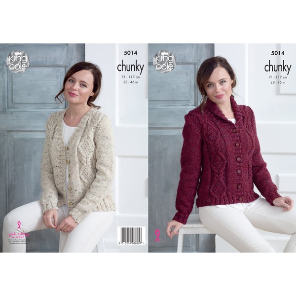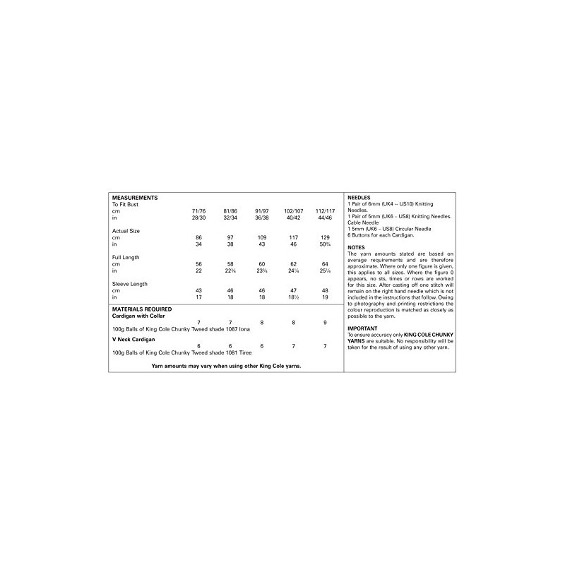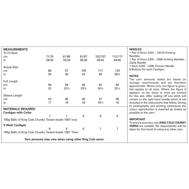 - The yarn requirements for the garments in this leaflet are as follows: Cardigan with a Collar to fit bust 28" / 30" [32" / 34": 36" / 38": 40" / 42": 44" / 46"] use King Cole Chunky Tweed 100g - Iona (1087) 7 [7: 8: 8: 9] balls. V Neck Cardigan to fit bust 28" / 30" [32" / 34": 36" / 38": 40" / 42": 44" / 46"] use King Cole Chunky Tweed 100g - Tiree (1081) 6 [6: 6: 7: 7] balls.