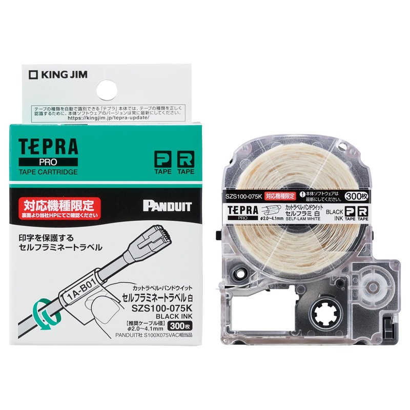 King Jim SZS100-075K Tepra PRO Tape Cartridge, Cut Label, Panduit Self-Laminated Label (Compatible Models: SR-R980 Only), White Label/Black Letter, 300 Sheets