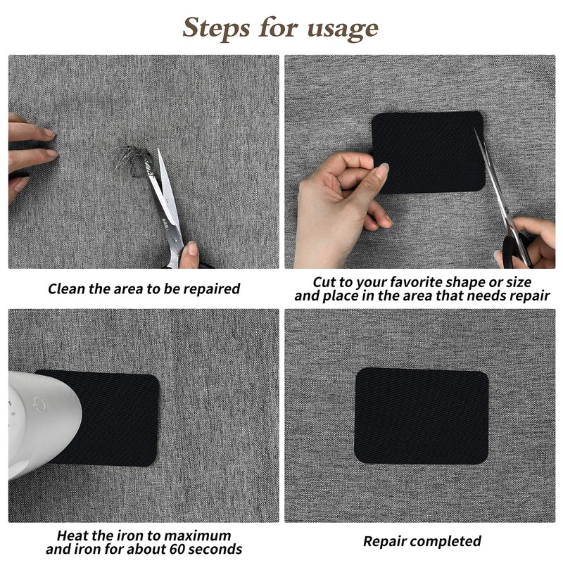 - SIMPLE APPLICATIONS: with only one iron, preheat the iron to the maximum, place the patch to the area to be repaired,and then the iron patch for about 60 seconds to complete the repair. Repair can be completed in just a few minutes, simple and quick. Sufficient amount of hot melt adhesive on each patch that no additional glue is ever needed.