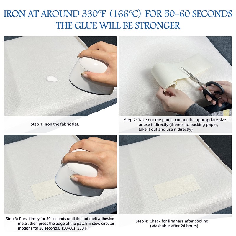 • Wide Applications: Fabric patches work well with fabrics such as linen, velvet, suede, cotton, leather, and nylon. You can DIY cut and design any shape you like on clothes, sofas, tents, car seats, handbags, luggage, curtains and other items, and repair and reinforce them to make it look more creative.