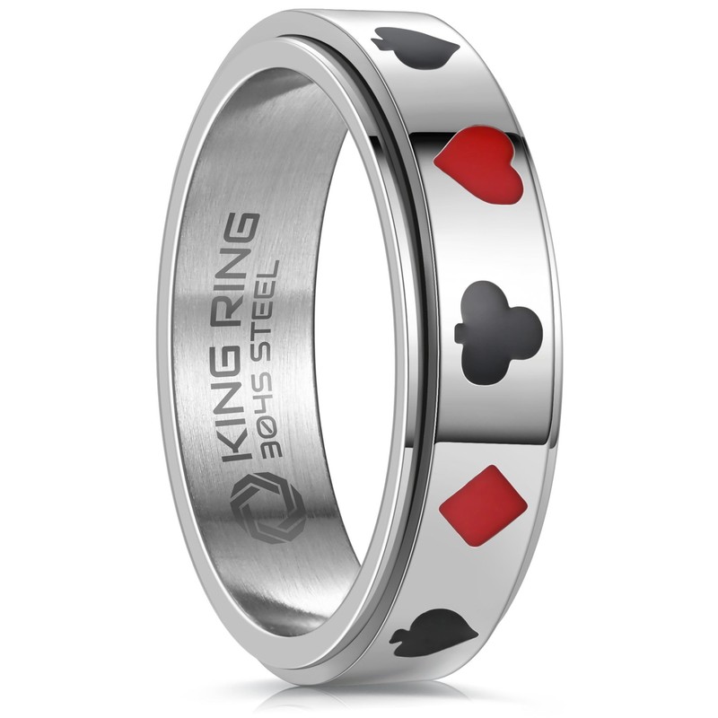 Introducing the King Ring K49, a stylish spinner ring crafted from high-quality 304 stainless steel, designed for both men and women. This ring features the unique Ace design, incorporating the classic symbols of playing cards - hearts, clubs, diamonds, and spades - in a sleek, polished silver finish that offers both sophistication and fun.