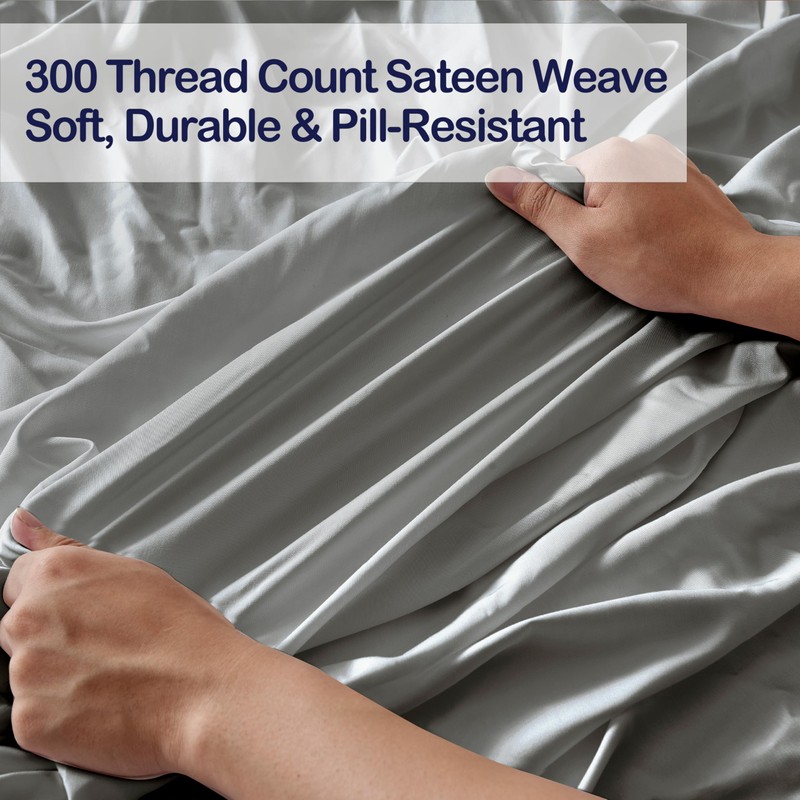 - 300TC SATEEN WEAVE DURABILITY: Woven with a 300 thread count sateen finish, these sheets offer an optimal blend of softness and strength. This construction resists pilling and maintains a smooth fabric that feels comfortable over time, providing lasting quality wash after wash.