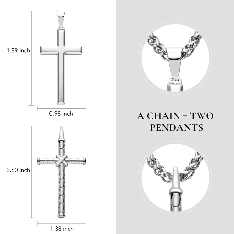 Features: 1. Trustworthy Brand: King Will has focused on three core values since its inception: providing high-quality products, innovative designs, and exceptional customer service. thoughtful customer service 2. Crafted from premium stainless steel, this necklace offers solid and durable material, hypoallergenic, will not tarnish or rust easily, perfect for daily wear and active lifestyles. 3. Chain & Pendant Size: chain - 20" in length cross pendents - one 1.89 x 0.98 inch, another 2.6 x 1.38 inch national flag style pendents - one 1.5 x 0.94 inch, another 1.57 x 0.89 inch 4. Versatile & Easy to Maintain: You can wear the chain only, or wear it with a pendent, or wear with a ring as you like - either way will shows your unique temperament. Resistant to water, sweat, and wear, this necklace is easy to clean.