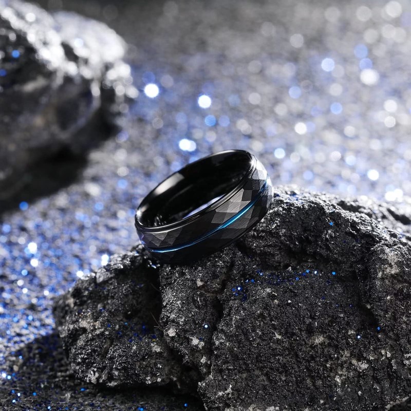- COOL DESIGN: Black 8mm Tungsten Ring Hammered Multi-Faceted Blue Groove Center, an artistic design style.