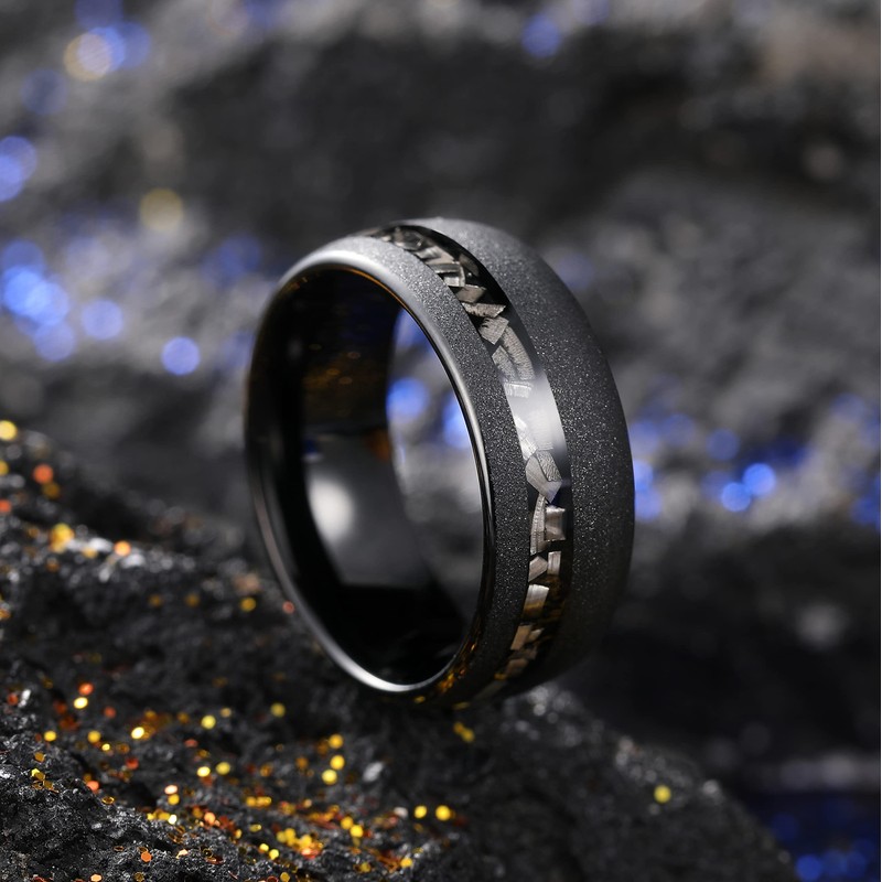 • COOL DESIGN: Black 8mm Domed Black Tungsten Ring Imitated Meteorite Inlay Matte Brushed, like a shining galaxy.