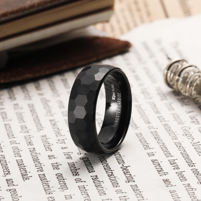 King Will Tungsten Carbide Wedding Band for Men - 8mm Black Hexagon Hammered Design Matte Finish Ring for Everyday Wear Comfort Fit 8.5