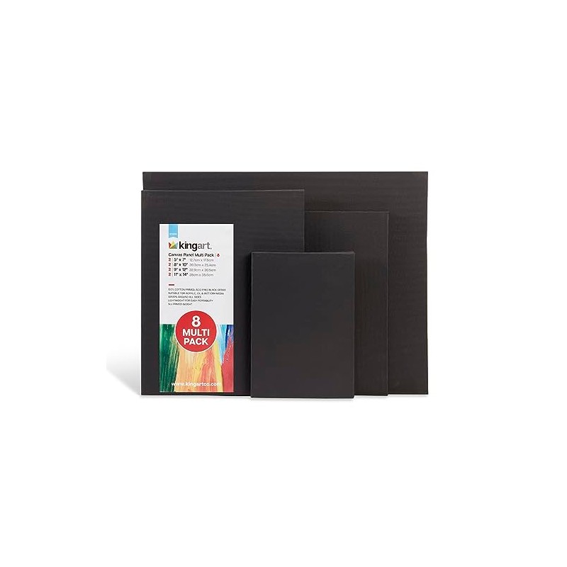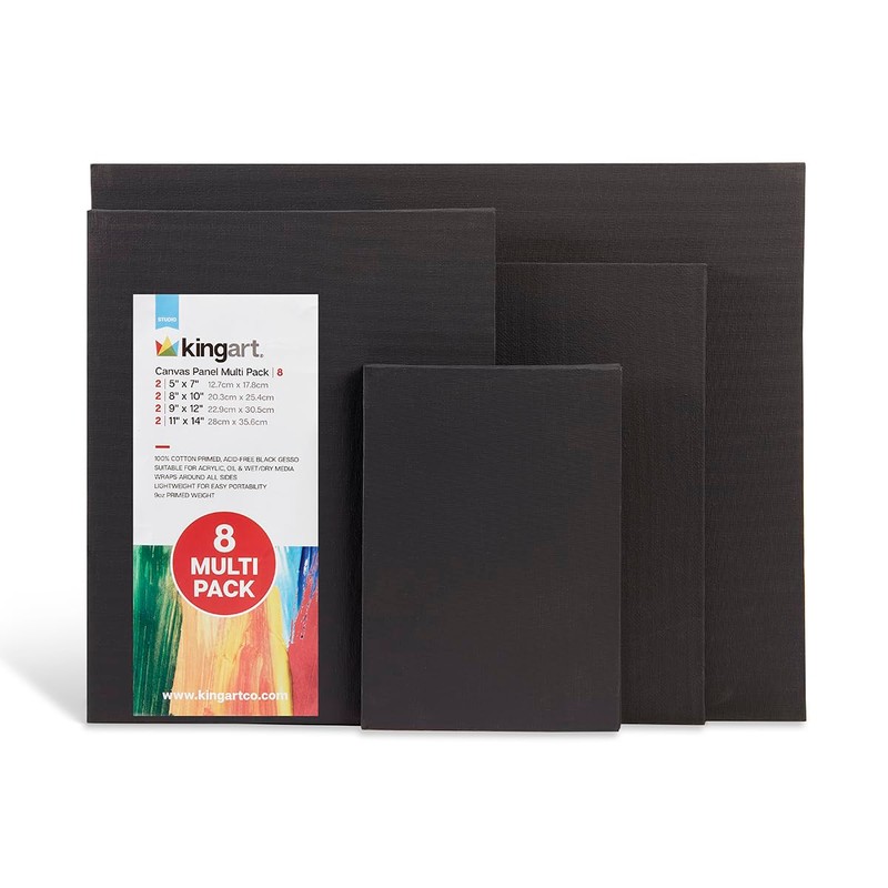 KINGART 880-8 Black 8 Pc. Multi-Size ARTIST CANVAS BOARDS, Gesso Primed - 100% Cotton Rectangular Boards, Art Supplies for Oil and Acrylic Paint, 2 Ea. 5x7, 8x10, 9x12, 11x14