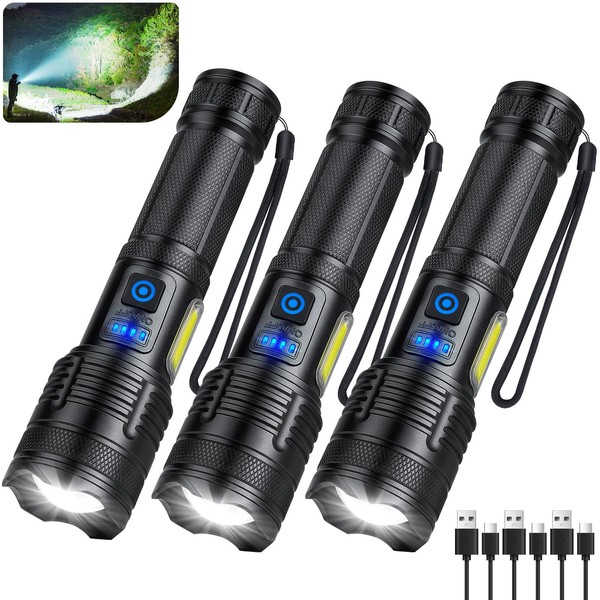 KINGCAESAR 3 Pack Rechargeable Flashlights 990000 High Lumen, Ultra Bright LED Flash Light for Home, High Powered Flashlights with 7 Light Modes, IPX7 Waterproof for Camping