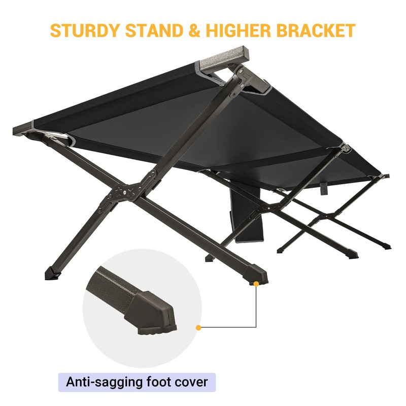 - 【Stable Frame】Our outdoor bed Camping Cots Weighs 21.3 lbs. Folding bed with square iron pipe support, thickened pipe wall, plastic spray treatment on the surface, anti-corrosion and the X-shaped leg bracket is more stable and will not shake randomly. Uniform pressure on the bed frame for more peace of mind when you lying down.