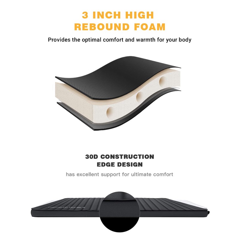 - ▶3 INCH THICK SLEEP SUPPORT- R Value: 9.5. The self inflating sleeping pad features 3 inch thick high rebound foam, keeping you and you lover warm by insulating the coldness or keep you from jagged rock or uneven cold ground.Provides the optimal comfort and warmth your body needs for getting a good night's rest.