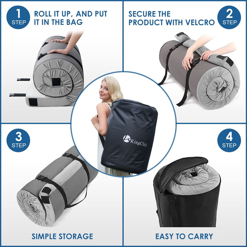 KingChii Memory Foam Camping Mattress, Portable Roll Up Sleeping Pad for Travel & Guest Bed for Sleepover with Waterproof Cover & Travel Bag