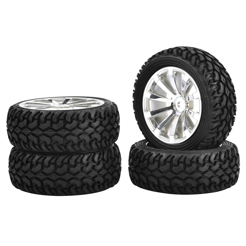 KINGCOO RC Car Tyres and Wheels Set, 4 Pieces 75 mm Rubber Tyres and Plastic Wheels 10 Spoke Rims for 1/10 RC On Road Racing 1/16 RC Rally Car for Kyosho Tamiya HSP HPI (Silver)