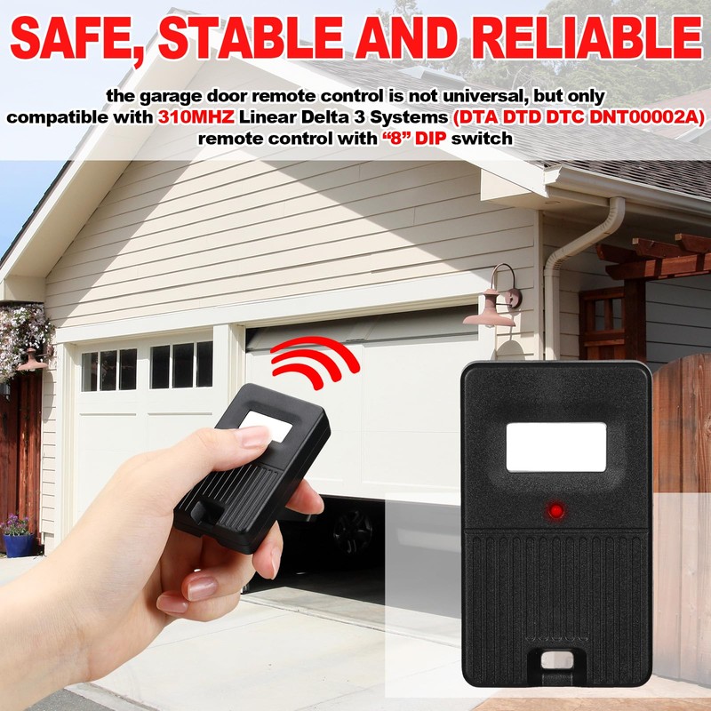 - Compatible Models: the garage door remote control is not universal, only compatible with Linear Delta 3 DTA DTD DTC DNT00002A 310MHZ remote control with 8 position DIP switch; Please pay attention to the information before purchasing