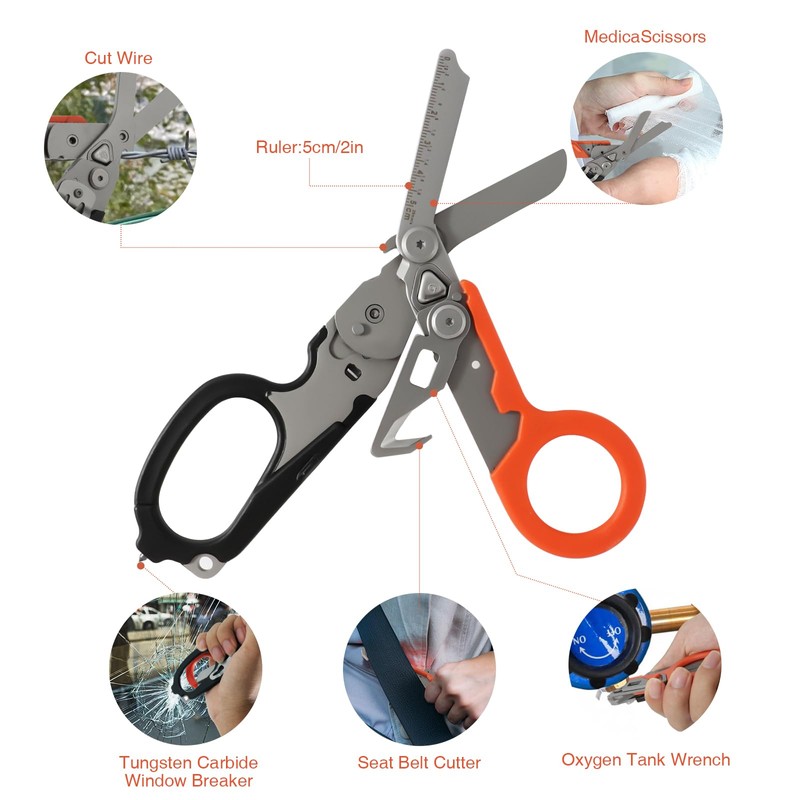 - MULTI-FUNCTIONAL BUILT-IN DESIGN The rescue scissors combine six essential tools into one, including foldable emergency cutters, belt cutters, ring cutters, ruler, oxygen bottle keys and carbide glass breaker.