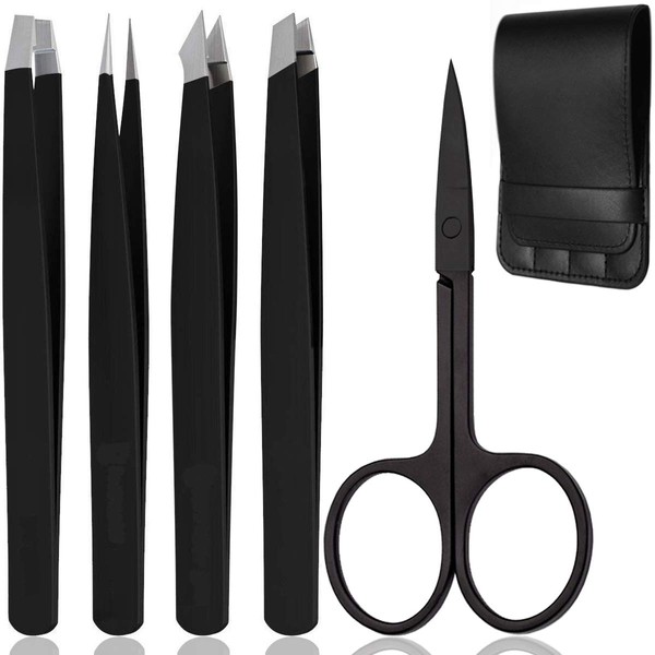 KINGMAS Tweezers Set, Tweezers, Cosmetic Tweezers, Taper, Diagonal, Flat Tip, Tapered Diagonal, Eyebrow Scissors, Set of 5, Eyebrow Nippers, Eyebrow Scissors, Stainless Steel, Precision, Men's, Lady, Eyebrow Kit, PU Case Included (Black)