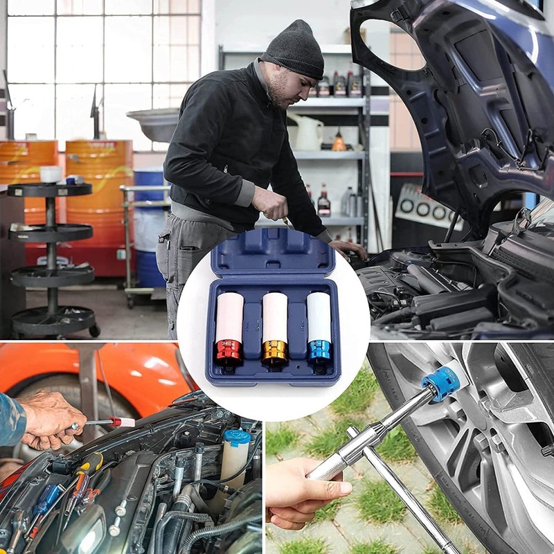 - [Very versatile] The socket set is perfect for changing wheels and provides maximum protection for sensitive rims and alloy wheels. Ideal for painted, painted, chromed and other factory and aftermarket wheels/cleats. Compatible with all 1/2" sockets, power or pneumatic tools. Widely used for manual and automatic impact wrench work with high loads, high power transmission, precise adjustment and hand tightening.
