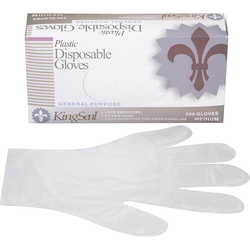 These KingSeal poly disposable gloves are size Medium, fully embossed for