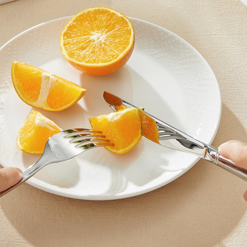 - SILVERWARE SET INCLUDES: 20-piece flatware set includes 4 dinner knives (9 inch/2.76 oz), 4 dinner forks (8.14 inch/2.35 oz), 4 dinner spoons (8 inch/2.3 oz), 4 salad forks (6.95 inch/1.68 oz) and 4 teaspoons (6.8 inch/1.9 oz), service for 4