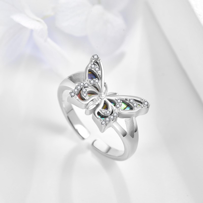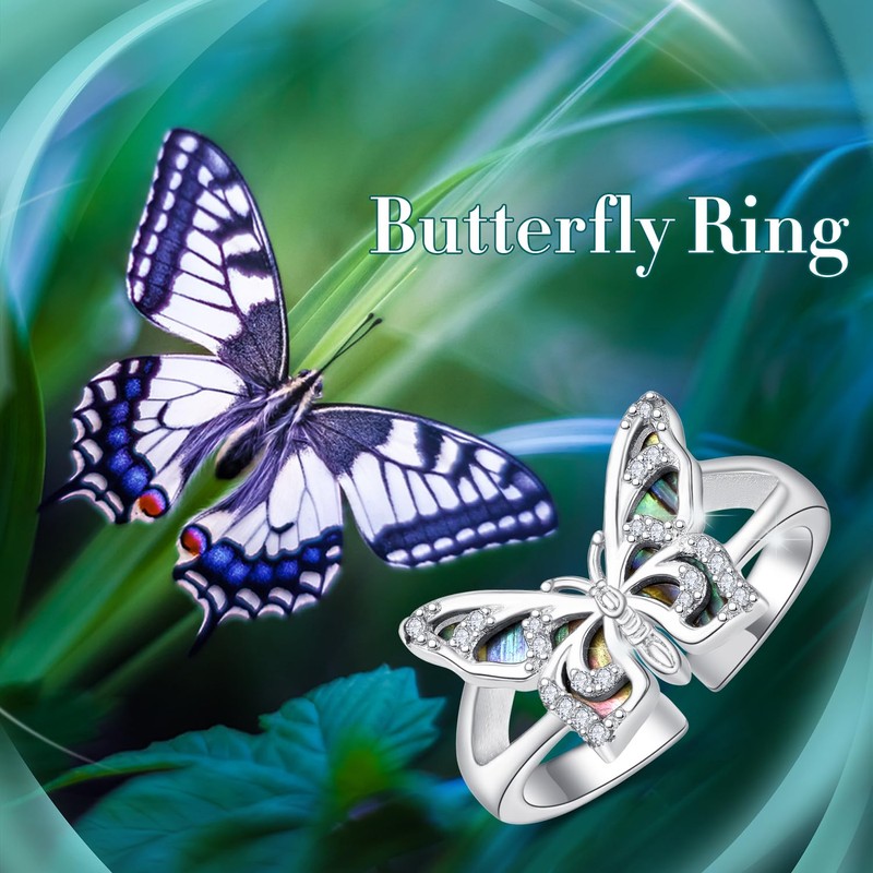 💗Elevate your style with the KINGWHYTE Butterfly Ring, a stunning piece of jewelry that combines elegance and charm. Crafted from high-quality 925 sterling silver, this open adjustable ring features a mesmerizing abalone butterfly and sparkling cubic zirconia stones. The intricate design and attention to detail make it a true masterpiece.