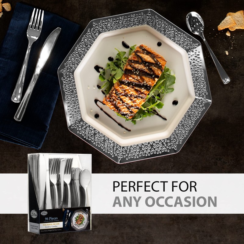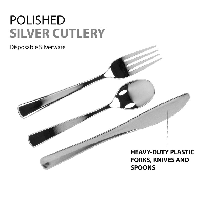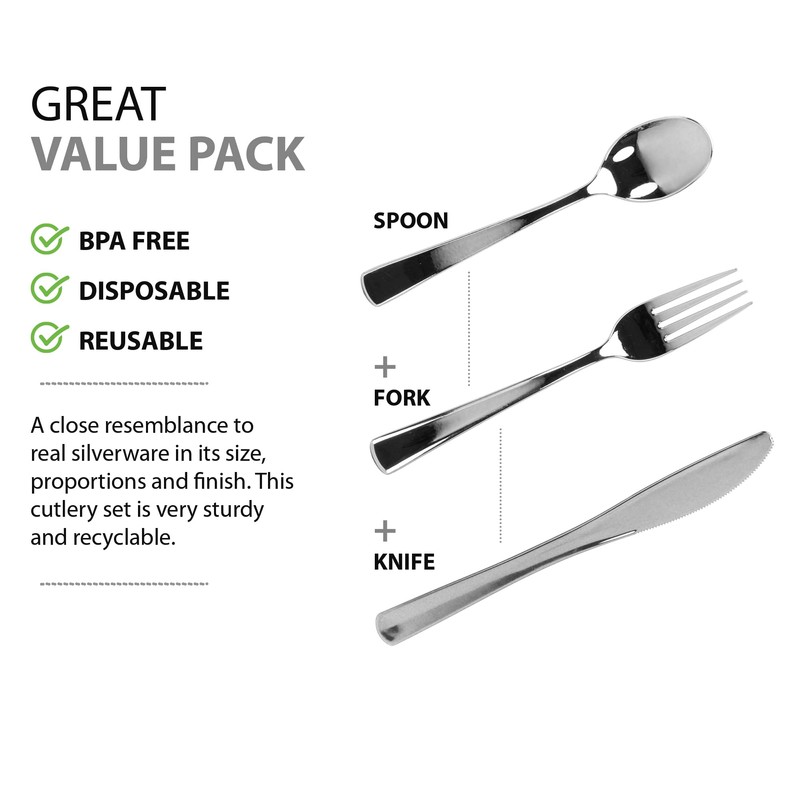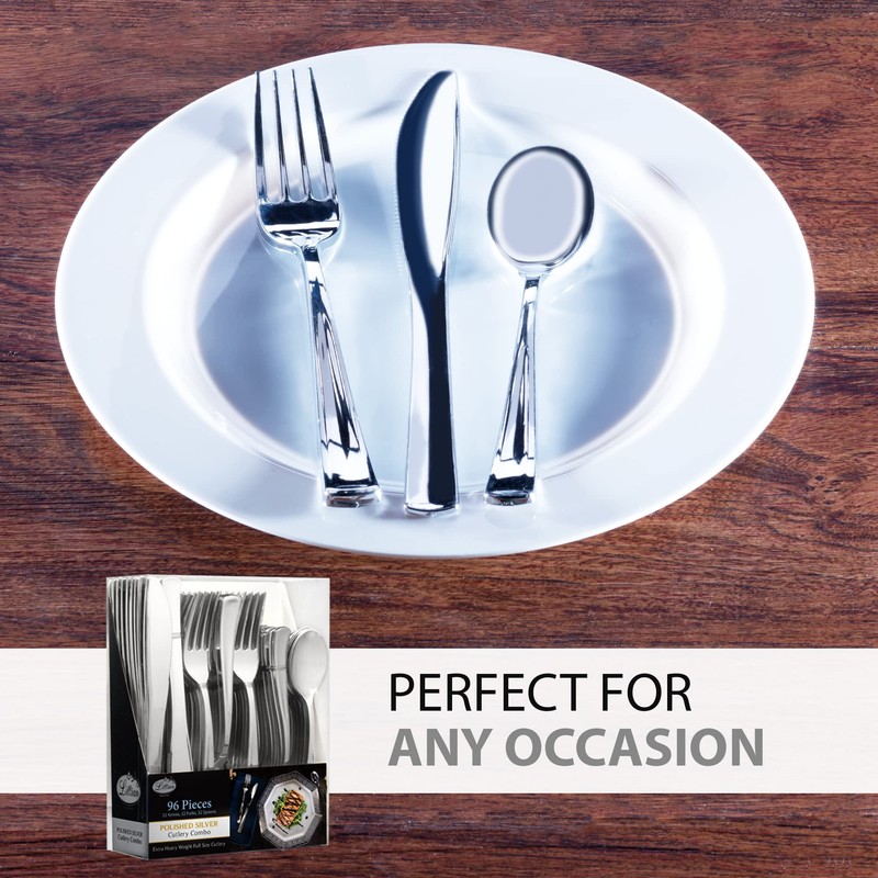 KingZak Premium Polished Plastic Cutleries, Full size,96 Pcs, Silver