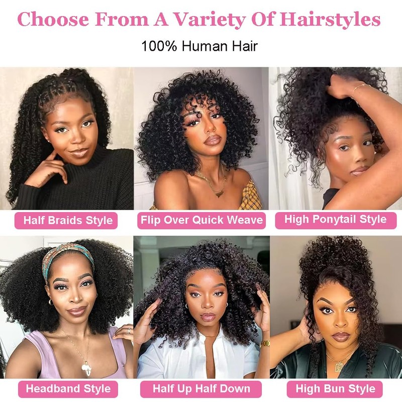 Kinky Curly Half Wig Human Hair 200 Density Glueless Wear and Go Headband Wig Human Hair for Women 3 In 1 Drawstring Seamless Flip Over Curly Half Wigs Human Hair Beginner Friendly Half Wig 18 Inch