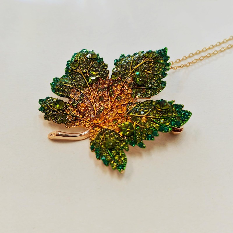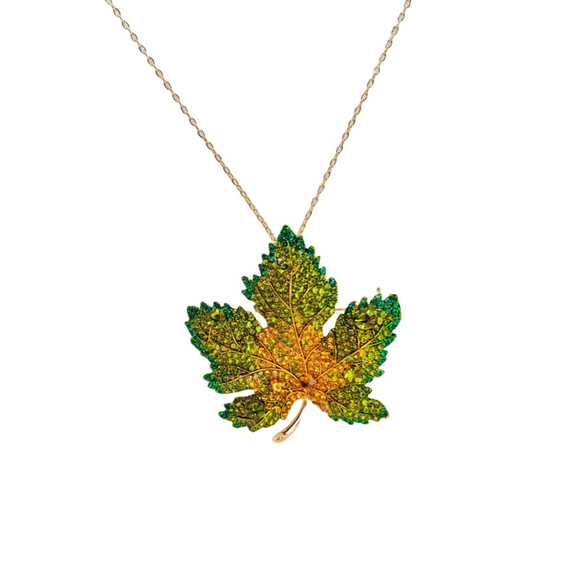 - DESIGN HIGHLIGHT: Exquisite maple leaf pendant featuring a stunning gradient of green to yellow crystals set in a detailed gold-tone frame