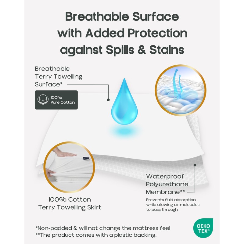- All Night Comfort: Enjoy the luxurious feel of our breathable 100% pure cotton terry towelling mattress protector. Lightweight and non-padded, it offers optimal softness and temperature regulation without altering the feel of your mattress, keeping you cool and sweat-free throughout the night.