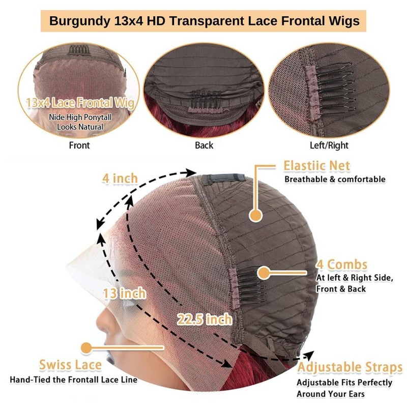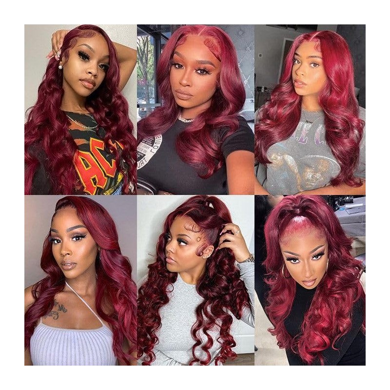 - BURGUNDY LACE FRONT WIGS HUMAN HAIR:180% Density 99j body wave lace front wigs human hair is all made of original Brazilian virgin human hair. 13x4 HD lace, invisible, durable and breathable. Pre plucked natural hairline with baby hair