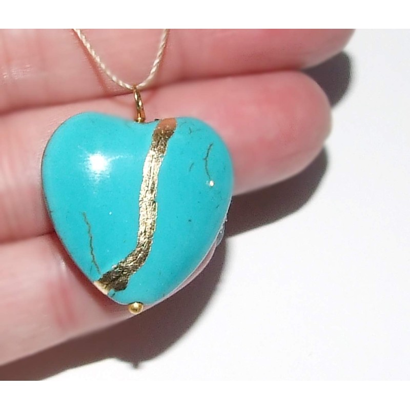 Kintsugi Large 1" Turquoise Howlite Broken Heart Mended with 23 Karat Gold, C...