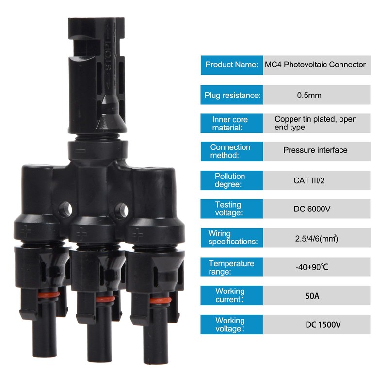 - Product Data: Below are electrical specifications of our solar panel extension cable connectors: - Test Voltage: DC 6000V - Plug Resistance: 0.5mmΩ - Wire Specification: 2.5/4/6mm² - Operating Current: ≤50A - Operating Voltage: ≤DC 1500V - Temperature Range: -40°C to 90°C - Connection Method: Crimping - Pollution Level: CAT III/2