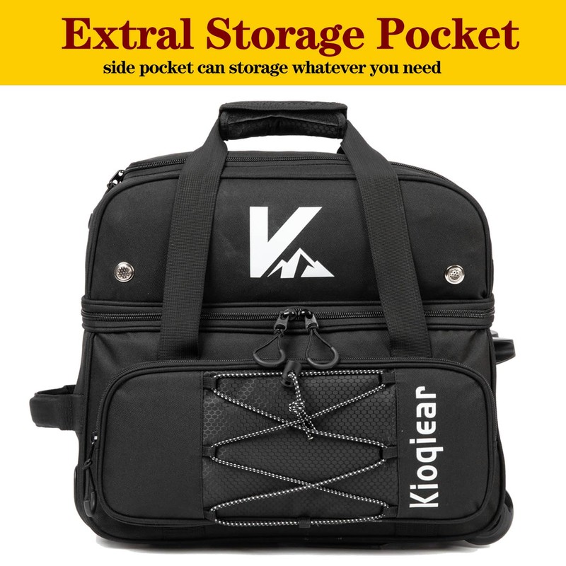- Separate Shoe Compartment - The Kioqiear double roller bowling ball bag main compartment can easily accommodate 2 bowling balls, top compartment with air vents which can store a pair of bowling shoes up to men size 15,extra storage pocket can store small items.