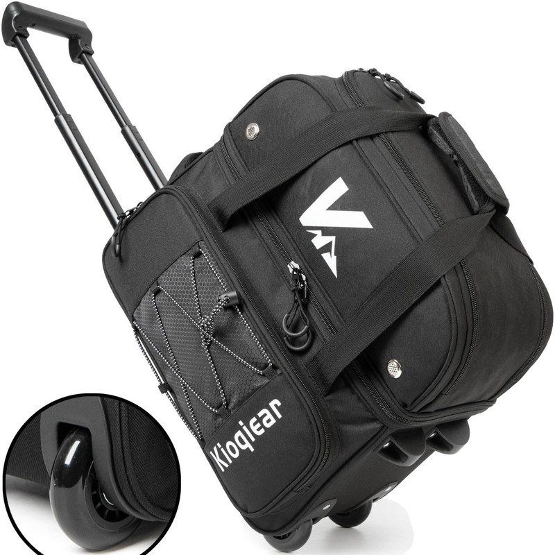 Kioqiear double roller bowling bag is great for bowlers who looking for a convenient bowling bag that could carry double balls and sporting essentials. This bowling bag made with sturdy 600-denier polyester oxford material for long-lasting durability and reliability and padded divider help keep the balls in position, no sliding.This 2 ball bowling bag with wheels has a large zippered top compartment for a pair of bowling shoes up to a men size 15.At the same time, it is designed with a lined handle, which can easily load/unload the bag into the car.