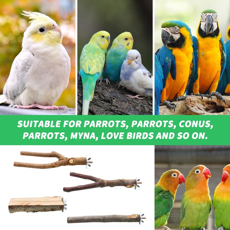 KIPTVO 4PCS Natural Wood Bird Perch, Budgie Perches, Parrot Perch, Wooden Perch Bird Swing, T Stand Parrot Perch Stands, for Parrotlets Cockatiels Budgies Parakeets Parakeets Lovebirds