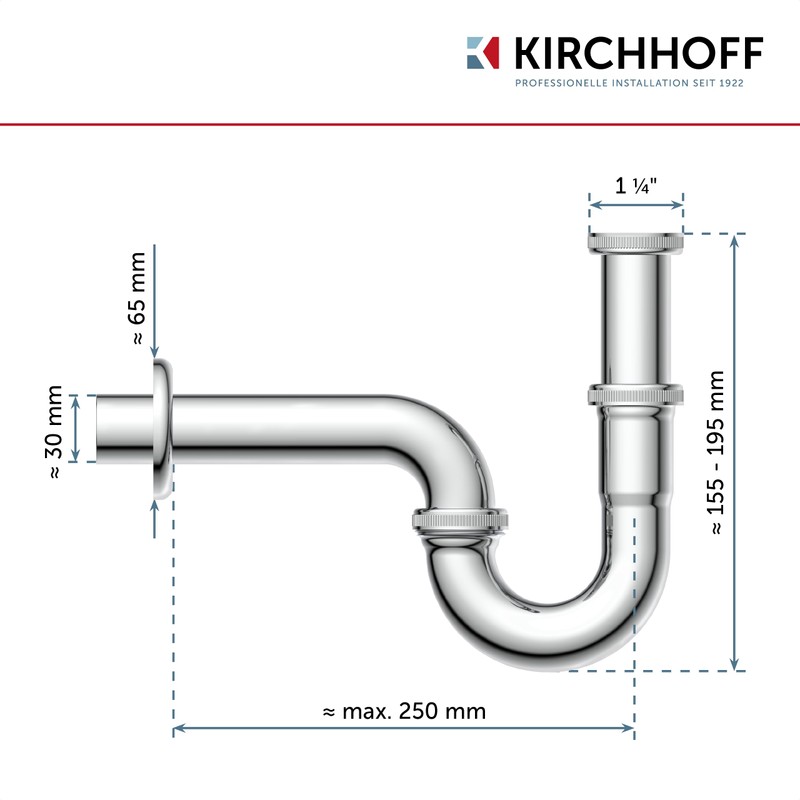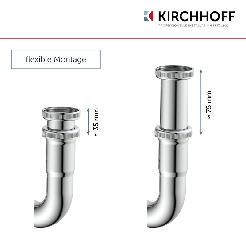 - Kirchhoff quality: Solid body made of chrome-plated stainless steel and precisely fitting seals ensure a long service life and reliable sealing of the sink trap