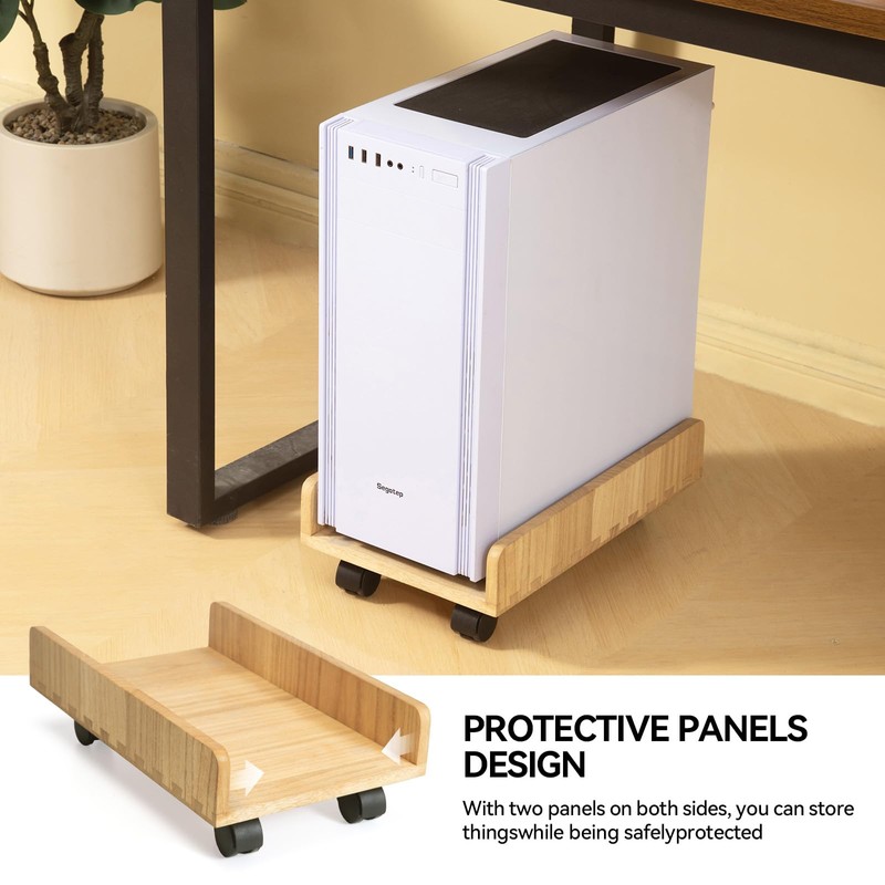 This computer case stand cart is made of selected solid wood,with strong bearing and cute design.It fits width within 8.5inch of atx and pc case.Mortise and tenon joint makes this mobile cart holder firm and stable.Two-side panels prevent the CPU tower from tipping over or scratching.Featured 4 mute rolling wheels so you can move the cart easily,you don't have to worry about draging when cleaning office desk.Two brake caster keep the mobile PC stand at rest when working.Bearing up to 50lbs,the wood CPU cart stronger than normal steel CPU rolling stand,you can put it under or beside desktop.If you want a computer host stand this wooden pc shelf must be a wise choice.