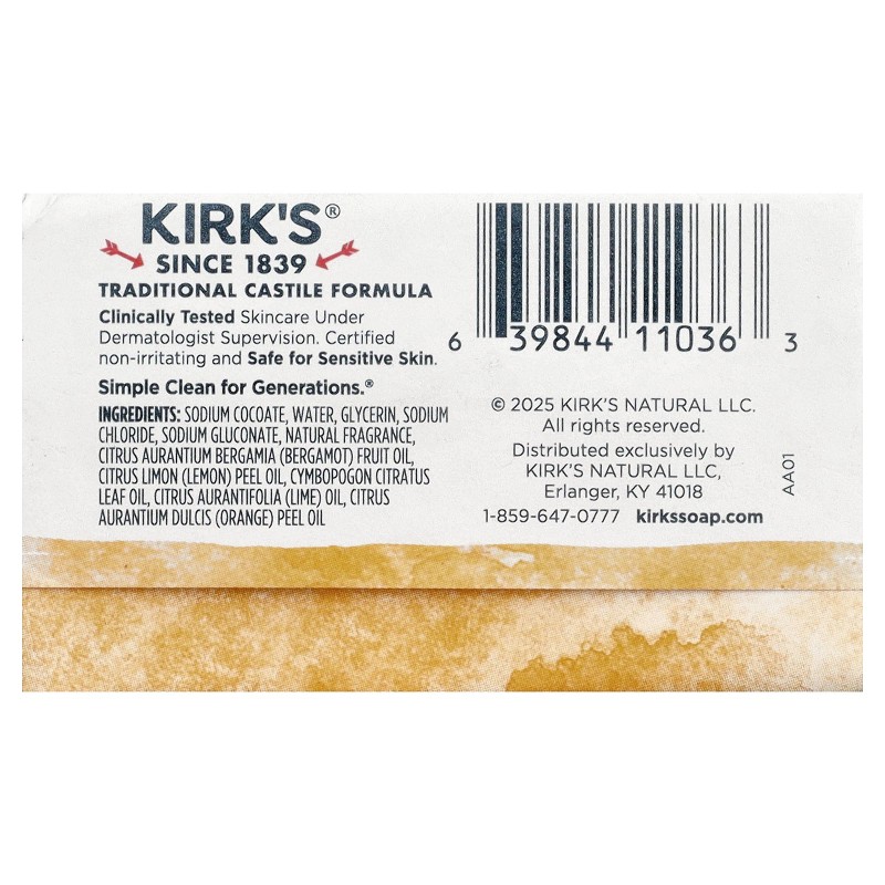 Our receiving department does its best to verify and then enter the correct expiration dates for all incoming products. However, discrepancies do occur from time to time. This being said, the exceptionally high turnover at iHerb ensures that our inventory is among the freshest in the industry.Kirk's, Castile Bar Soap, Citrus Twist, 1.13 oz (32 g)