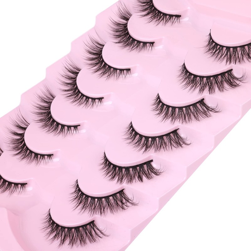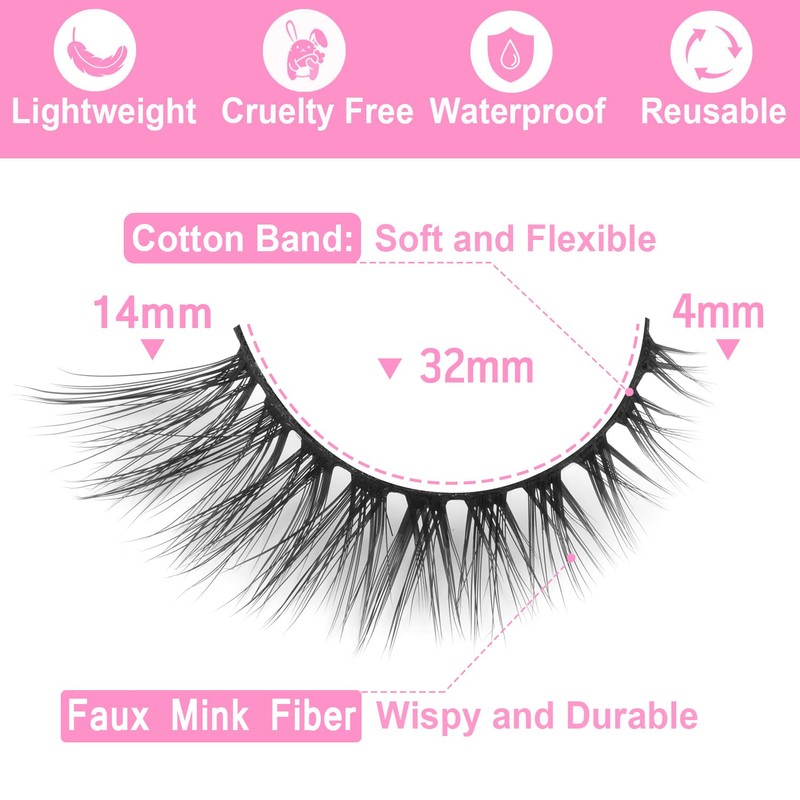 Specification of Kiromiro eye lashes sets pack:1. Material: Faux mink eyelashes pack2. Length: 14mm fake eyelashes natural look3. Style: Natural lashes pack4. Package: 7 Pairs wispies eyelashesAdvantage of wispies eyelashes1. 100% Handmade lash extension strip eyelashes. Soft and lightweight.2. Soft cotton thin band, hypoallergenic, invisible and comfortable.3. Featured synthetic fiber, durable and wispy.How to Apply kiromiro false eyelashes pack1. Trim faux mink eyelashes to fit your eye size.2. Adjust the false eyelashes to fit your eye curve.3. Add glue along colored lashes cotton band.4. Close the eyes as appropriate and ensure a proper fit by blinking.