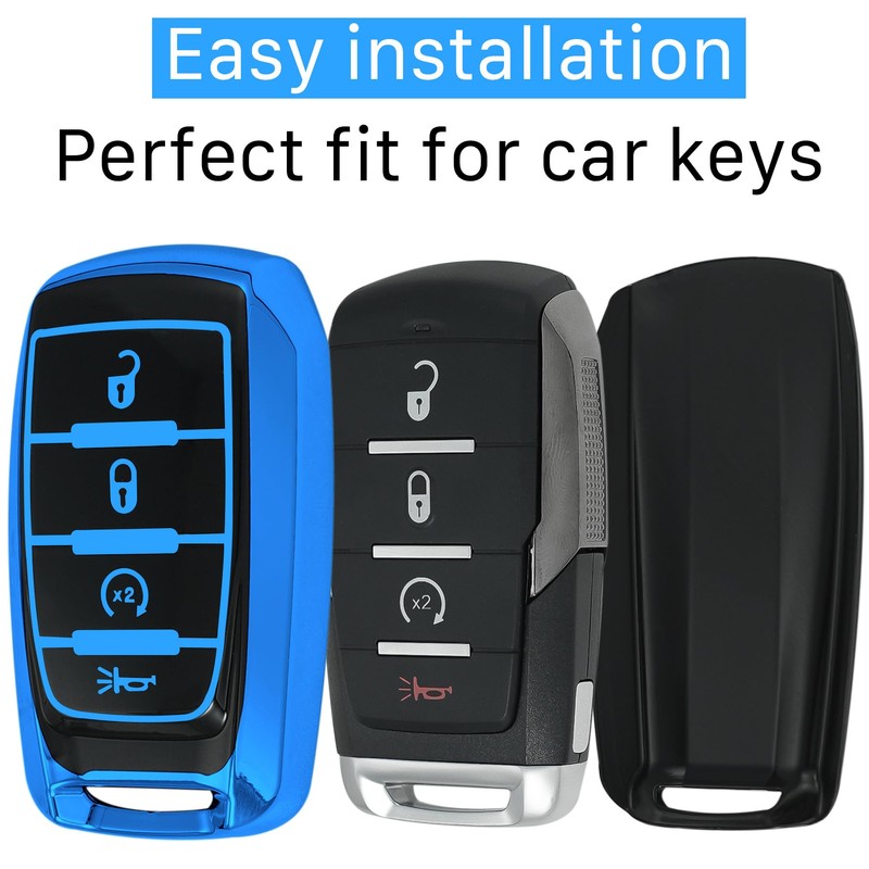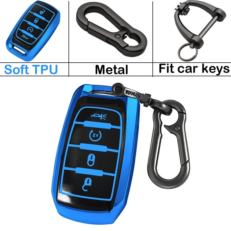 Kirsnda Key fob Cover with Metal Buckle Compatible with Dodge RAM 2500 3500 4500 ect Smart Remote Key,Key Accessories,TPU Protection Key Case(4 Buttons Blue)